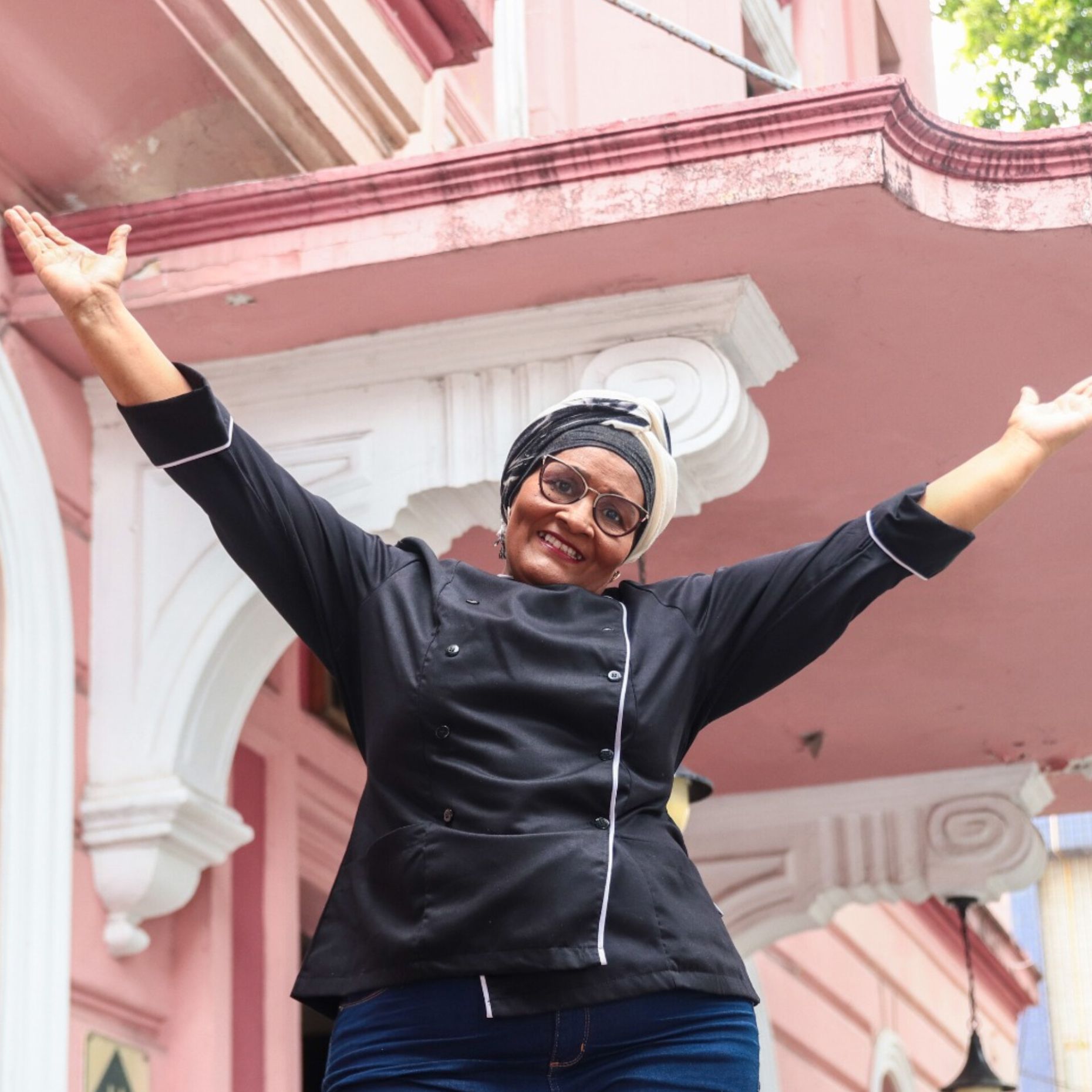 Foto em destaque de Rosa Maria na entrada do Hotel Central: Rua Pablo.