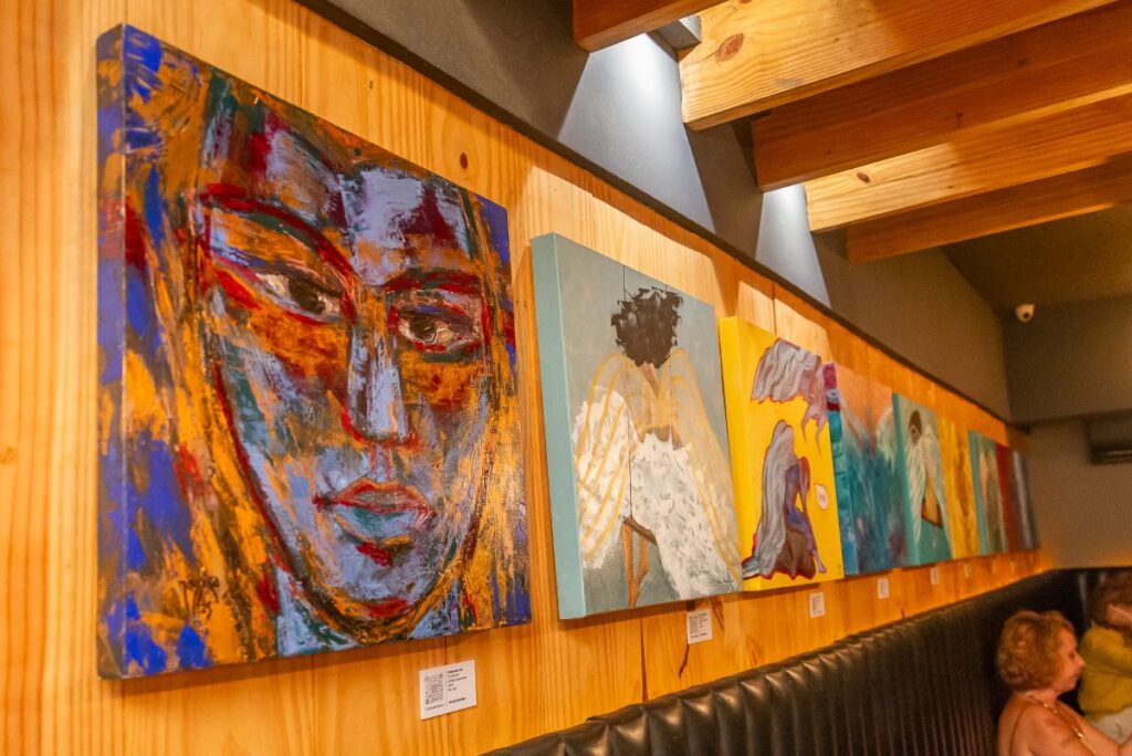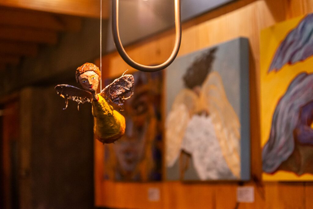 Nas paredes, obras inéditas de Clériston, Clélia Barqueta, Jéssica Martins, Joka Cordeiro e Kátia Angelim, além dos anjos em papel machê criados por Diana Tenório (alguns em voo, outros pousados).