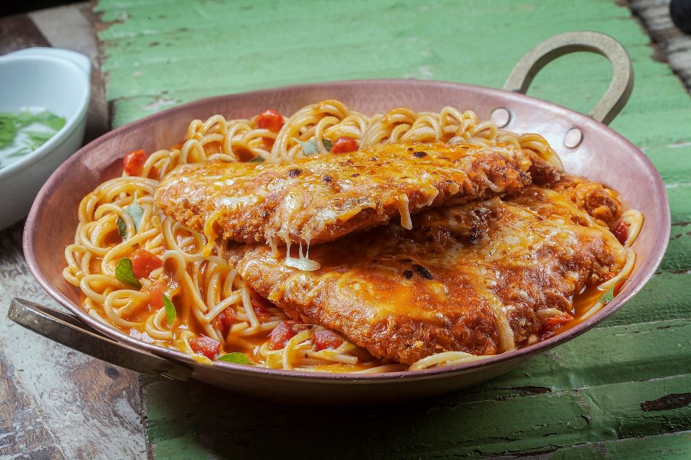 Filé à Parmegiana, porque um clássico é um clássico – aqui, empanando na farinha panko, ok? R$ 99,00.