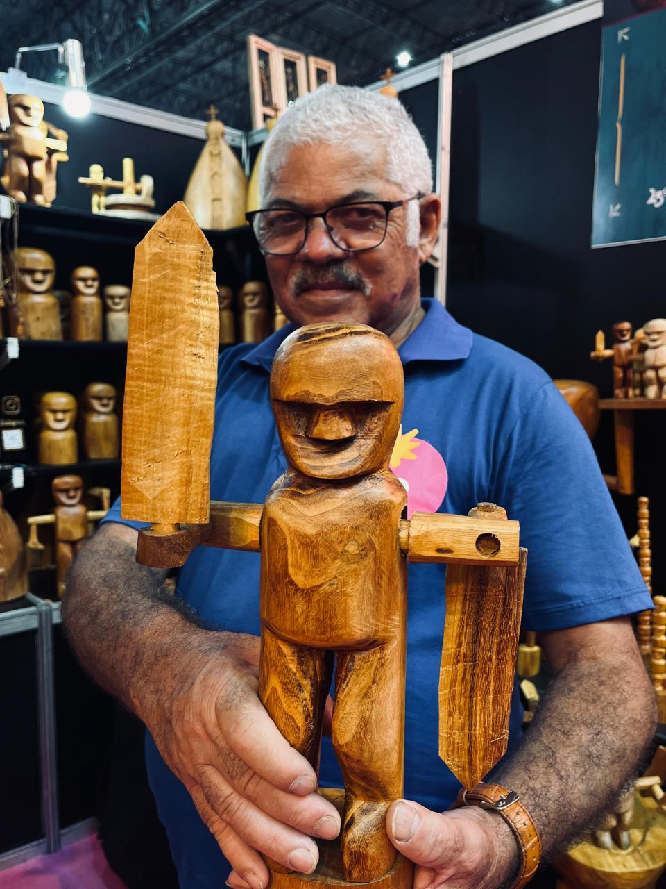 Autodidata, é reconhecido por transformar madeira em narrativa – desenvolveu um estilo singular, com peças como o célebre Homem Catavento, escultura articulada cujos braços giram ao vento. Sua obra carrega a memória da cultura quilombola e já figurou em feiras de grande porte, como a Fenearte.