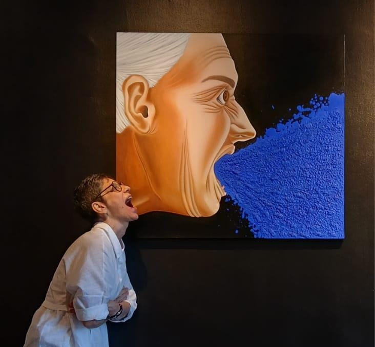 Em Mukha Dhouti, a artista visual pernambucana Dayse Pontes decidiu vomitar através de 14 telas, alguns frutos nefastos dos nossos medos pessoais: racismo, nazismo, gordofobia, homofobia, etarismo, a extinção da natureza, a gente anestesiada pelas redes sociais e há ainda, entre outras exalações, o vômito-grito-de-protesto-social que pleiteia, ao fim de tudo, amor.