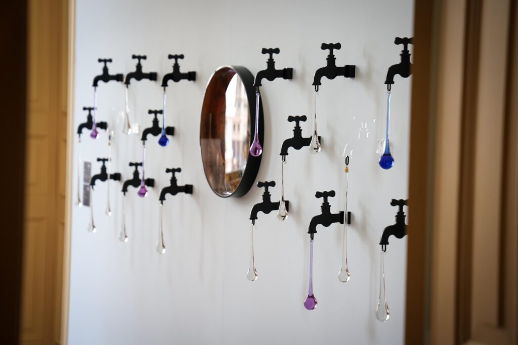Últimas Gotas, outra instalação, é composta por 30 torneiras com gotas de cristal, tensionando a relação entre abundância e escassez.