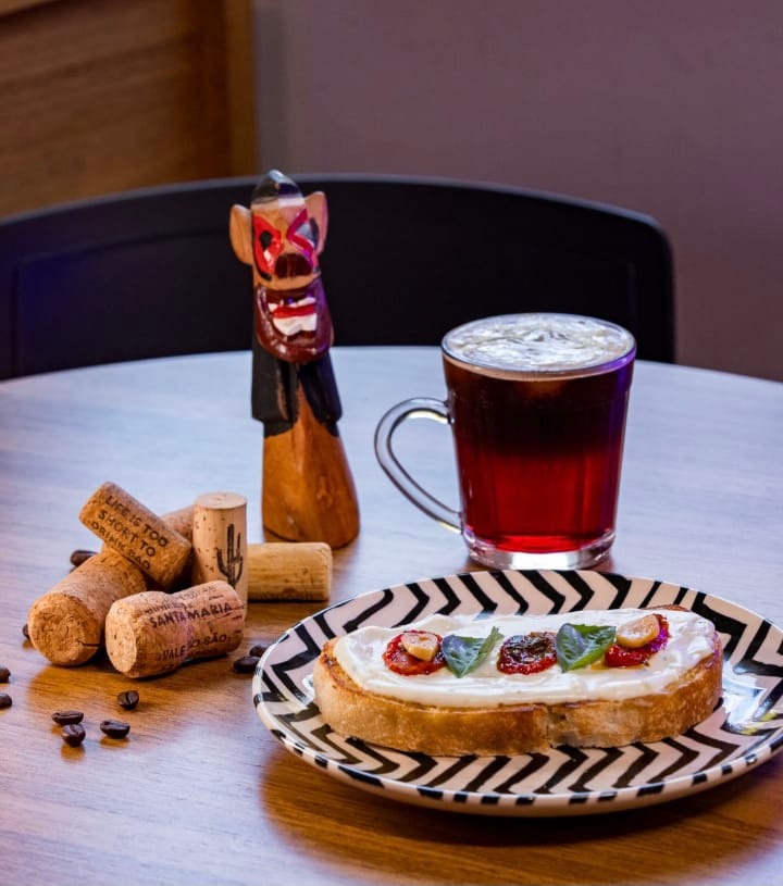 Um toast de fermentação natural com creme de gorgonzola, tomate seco & manjericão + Espresso Tonic Cabernet (drinque de café comercial geladíssimo, com espresso e água tônica; adoçado, suavemente, com uma redução de vinho tinto do Vale do São Francisco).