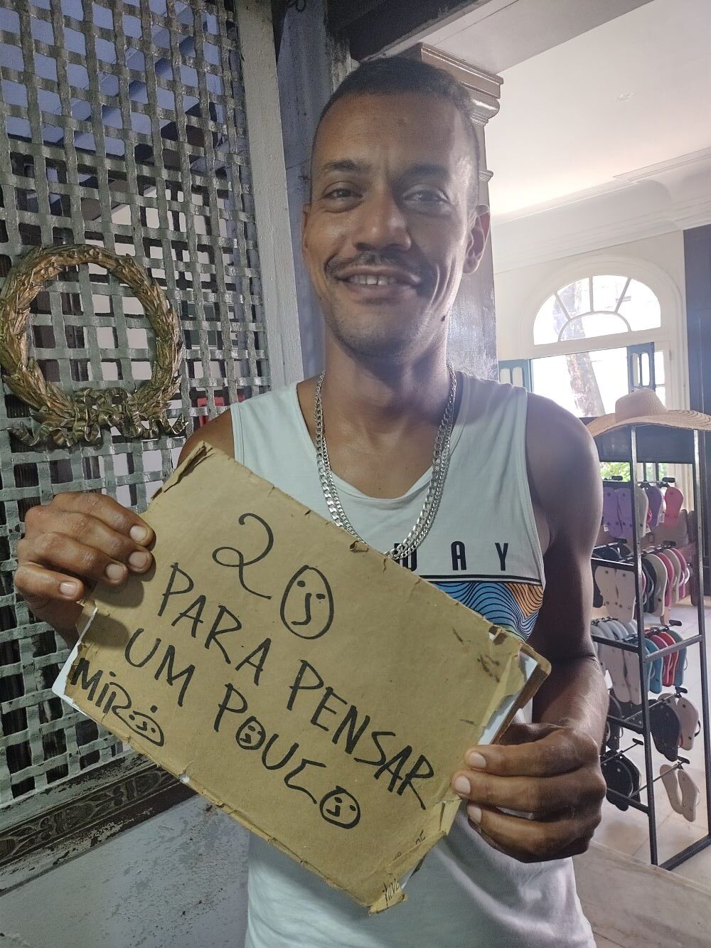 No coletivo, reconheceu Miró pela roupa: ‘Uma calça de estamparia africana, bata e colar’. Quando o poeta ficou de pé para pedir parada, Vanderson recitou: ‘Janela de ônibus nos faz pensar, ainda mais quando a viagem é longa’.
