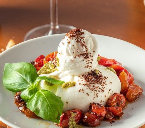 Abri os trabalhos com a Caprese de Burrata: burrata artesanal ladeada de tomates assados e pesto, acompanham torradas de ciabatta. Suavidade e força no mesmo prato – R$42,00. Foto acima.
